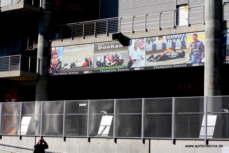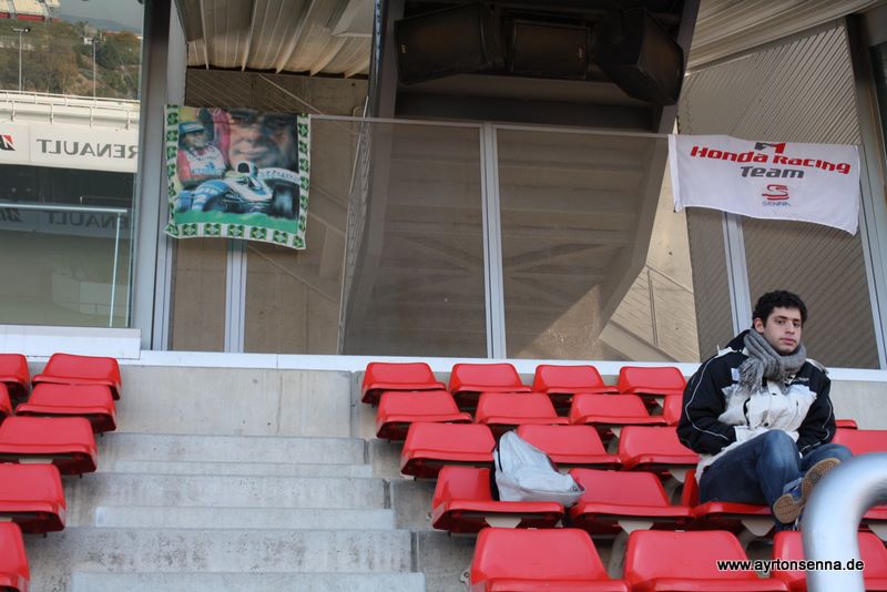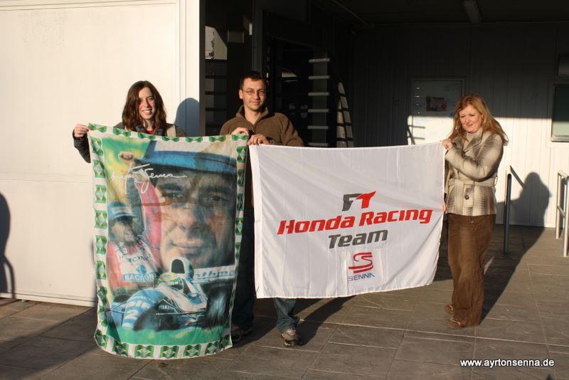 Im Hintergrund hingen die beiden Fahnen von Ayrton Senna und die Honda Fahne der Britischen Fans mit aufgenähtem Senna Logo