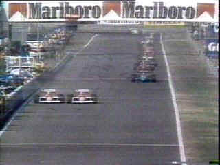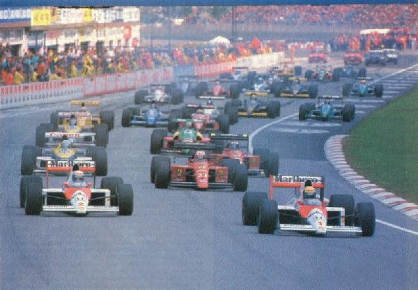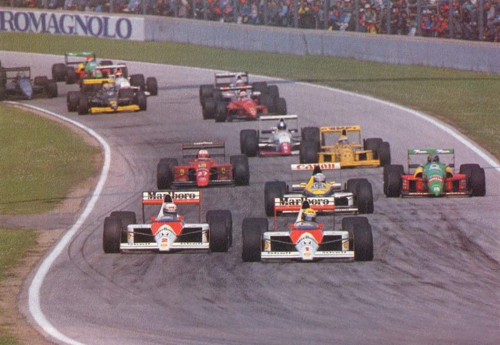 Erster Start. Noch ist Gerhard Berger im Ferrari (mit den gelben Punkten am Heckflügel) dabei. Nach dem schweren Unfall von Berger treffen Prost und Senna in der Rennunterbrechung bei, der Berger aus dem brennenden Auto befreit wird, ein Abkommen, dass der Führende nach dem Start auch das Rennen gewinnen soll und ein Nicht Überholen zwischen den beiden McLaren Honda nach der ersten Kurve gilt..