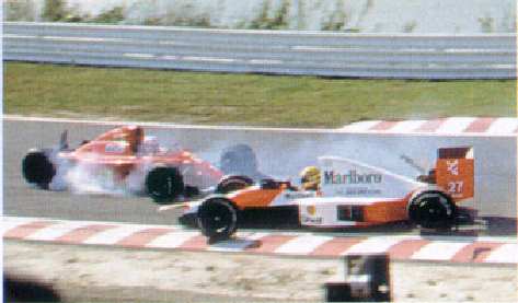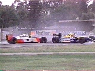 Nicht immer gingen die Duelle zwischen Senna und Mansell ohne Kollision aus. so wie in Monaco 1992. Bild unten zeigt die Kollision Senna Mansell in Adelaide 92 bei der Senna Mansell ins Heck fuhr beide Piloten lagen ganz klar vor allen anderen in Führung. Es war Mansells vorläuifg letztes Rennen in der Formel 1. Eindeutig Sennas Schuld da er zu dicht dem Williams Piloten im Getriebe saß.