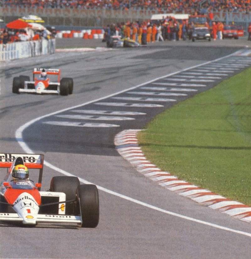 Berger fehlt beim Neu Start. Nur der Ferrari von Nigel Mansell ist im Rennen von Imola 1989 dabei. Problematisch ist die Auslegung der ganzen Sache ist die Tosa die erste Kurve oder voll gefahrene Tamburello Passage die eigentlich eine leichte Biegung darstellt.. Senna überholt vor der Tosa Kurve seinen Teamkollegen Prost innen und danach ihm auf und davon.