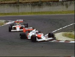 Während des Rennens hat Alain Prost zeitweise einige Sekunden Vorsprung auf Senna. Doch Senna schließt die Lücke. Schließlich folgt Senna Prost 1989 in Suzuka dicht (siehe nächstes Bild), kann aber auf den Geraden nicht überholen. Probleme an Sennas Schaltung und eine etwas zu steil eingestellter Flügel verhindern, dass Senna auf den Geraden an Prost vorbei ziehen kann.