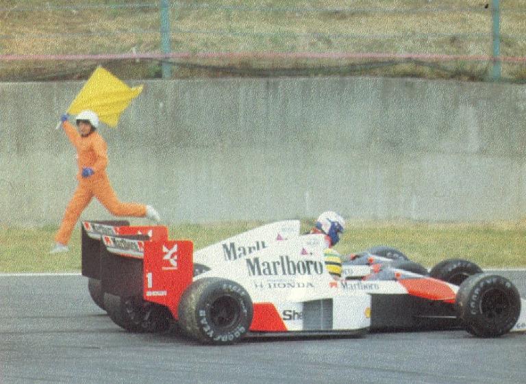 Senna und Prost verhaken sich ineinander bei der Kollision. Sennas Frontflügel ist beschädigt danach und muss gewechselt werden. Nach einer dramatischen Aufholjagd bezwingt Senna auch Nannini zum Erstaunen aller noch kurz vor Rennende. Sieg für Senna auf der Strecke doch am grünen Tisch wird ihm der Sieg aberkannt. Prost ist somit Weltmeister durch Sennas Disqualifikation in Suzuka. Einen Titel den sich Prost vor allem durch die vielen Defekte an Sennas McLaren im Jahr 1989 erringen konnte, bei denen Prost direkt von den vielen technischen Ausfällen Sennas profitierte (Phönix (Elektronik Defekt), Paul Ricard (Kupplungsschaden), Silverstone (Getriebeschaden), Monza (Motorschaden), Montreal (technischer Defekt), Estoril (Unfall mit disqualifiziertem Mansell)). Wen Senna ins Ziel kam siegte er immer ausser in Ungarn dort wurde er das erste mal seit er bei Mclaren fuhr von einem anderen Piloten auf der Rennstrecke besiegt. Bei allen Rennen in denen Ayrton Senna wegen technischem Defekt ausfiel, lag er immer in Führung 1989. Das sagt alles aus über die Extra Klasse von Ayrton Senna.