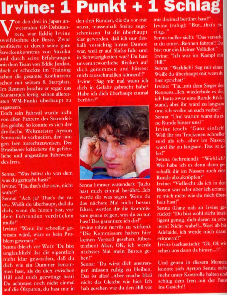 Der folgende Artikel ist aus der Zeitschrift Motorsport Life aus dem Jahre 1993 und schildert den Dialog zwischen Eddie Irvine und Ayrton Senna bevor Senna Irvine den Schlag verpasste.