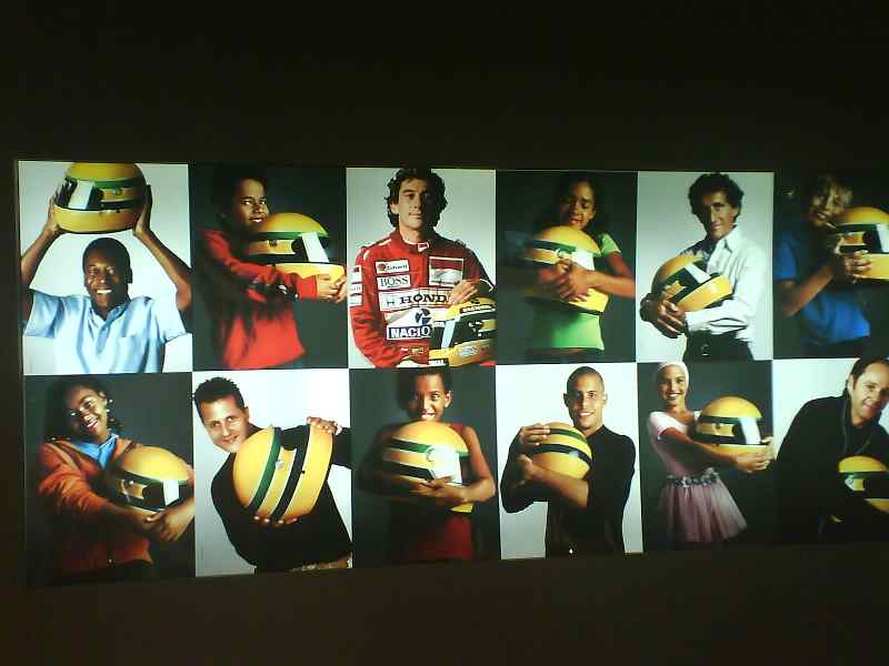 Einige berühmte Personen posieren mit Ayrton Sennas Helm. Brasiliens Fußballstar Pele, der vierfache Formel 1 Weltmeister Alain Prost, Gerhard Berger - Sennas Mc Laren Teamkollege von 1990 bis 1992, der Brasilianisch Nationalspieler Roberto Carlos von Real Madrid und Formel 1 Rekordweltmeister Michael Schumacher, der in Sennas Fusstapfen stieg nach dem tragischen Tod des dreifachen Weltmeisters in Imola.