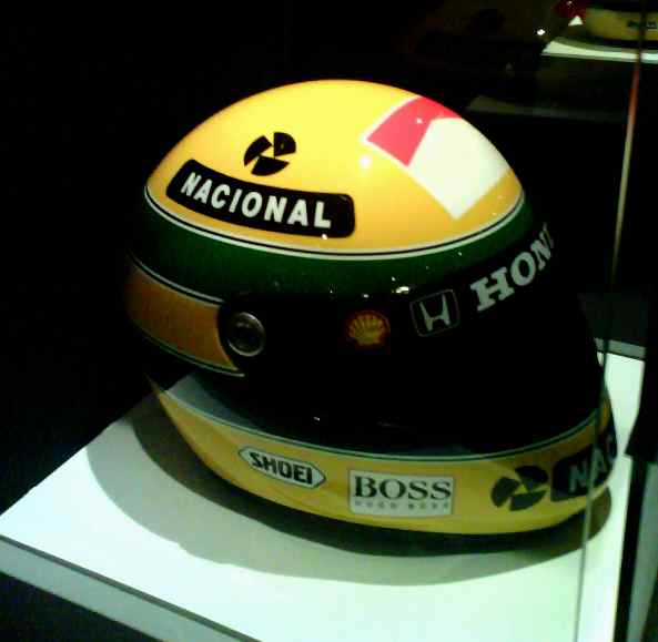 Ayrton Sennas Helme, die er in den Jahren trug, in denen er das Formel 1 Rennen in Monaco gewonnen hatte, waren ebenfalls in einer Glasvitrine ausgestellt. Insgesamt waren es also sechs Helme, die man sehen konnte. Hier ist der 1992 er Helm zu sehen auf dem Bild, den er trug als er die 92 er "Schlacht" in Monaco gegen Mansell gewann.