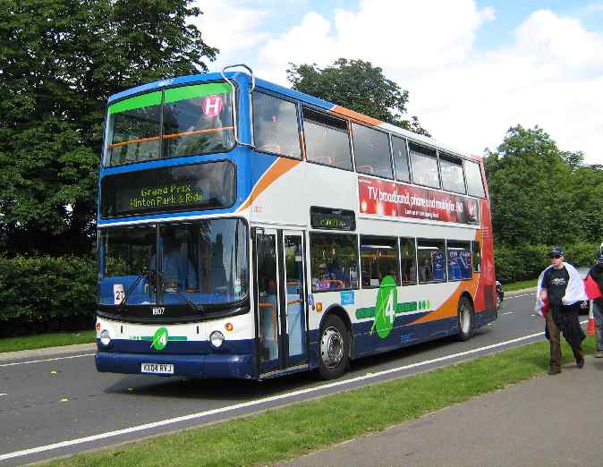 Die Doppeldecker Busse fahren zum Preis von 10 Pfund (ca. 15 Euro) von Northamphire (etwa 20 km) nach Silverstone.