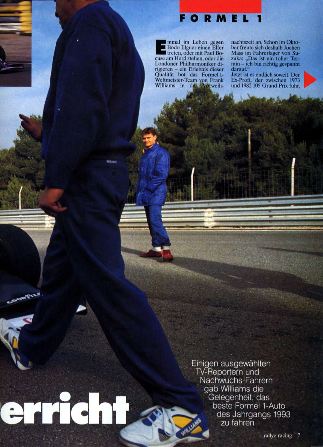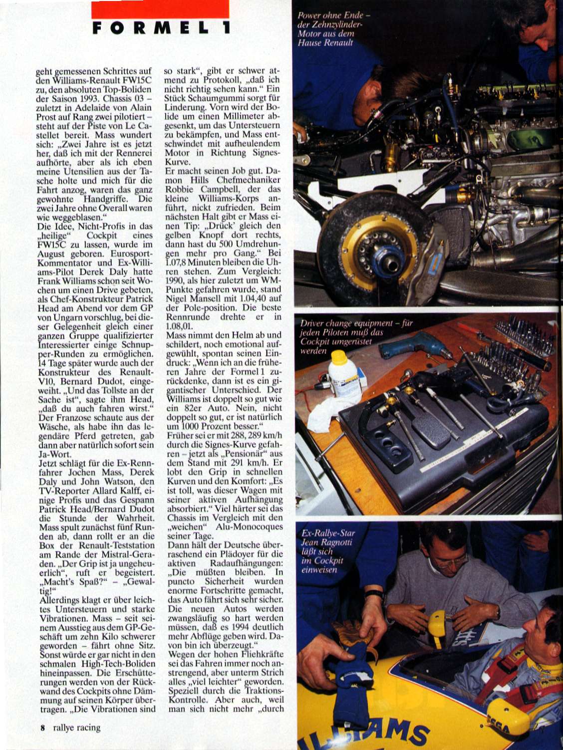 Der FW15 galt als der Massstab unter den F1 Autos des Jahres 1993 - sowohl vom Motor, als auch vom Fahrwerk, galt der Williams FW15 als das beste Auto in der Saison 1993. Er hatte ein aktives Fahrwerk (und Traktionskontrolle), im Vergleich zu seinem Nachfolger FW 16 (des Jahres 1994), der nur passives Fahrwerk hatte, aufgrund der Reglementänderung für 1994 waren aktive Fahrwerke verboten. Man wollte, dass wieder mehr der Fahrer und weniger die Technik und Elektronik in den Vordergrund der Leistungen rückt. Getestet wurde der Wagen unter anderem von Jochen Mass auf der Rennstrecke in Paul Ricard. (Quelle des Berichtes ist rallye racing 1/1994). Weitere Informationen zum jahr 1993 und zum Williams FW15 und zum Mc Laren Ford von 1993 findet ihr auch beim Link Rückblick 1993.
